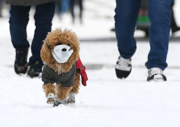 ഫേസ് മാസ്ക് ധരിച്ച നിലയില് തന്റെ ഉടമയോടൊപ്പം മഞ്ഞില് നടക്കാനിറങ്ങിയ വളര്ത്തുനായയുടെ ചിത്രം കാഴ്ചക്കാരില് കൗതുകമുണ്ടാക്കി.