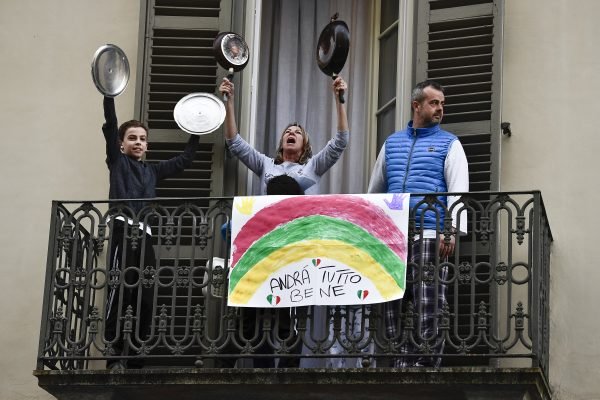 പാത്രങ്ങള് കൊട്ടി വീടിന്റെ ബാല്ക്കണിയില് നിന്ന് പാട്ടു പാടുന്ന കുടുംബം. 'എല്ലാം ശരിയാകും' എന്നാണ് മുന്നിലുള്ള ബാനറില് എഴുതിയിരിക്കുന്നത്. ഇറ്റലിയുടെ ഐക്യം ഉറപ്പിക്കാനായി ആഹ്വാനം ചെയ്ത പരിപാടിയുടെ ഭാഗമായായിരുന്നു ഇത്. ടൂറിനിലെ സാന് സാല്വാരിയോയില് നിന്നുള്ള ദൃശ്യം.